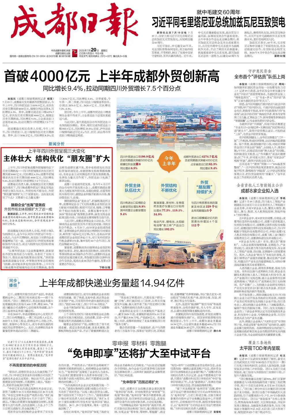 7月19日,成都海关发布最新外贸数据显示,今年上半年,四川外贸进出口5190.9亿元,首次在历史同期突破5000亿元,规模位列全国第8,同比增长6.3%。其中,成都完成进出口额4274.7亿元,首次在历史同期突破4000亿元,规模创历史同期新高,同比增长9.4%,占全省进出口总值的82.3%,拉动同期四川外贸增长7.5个百分点。