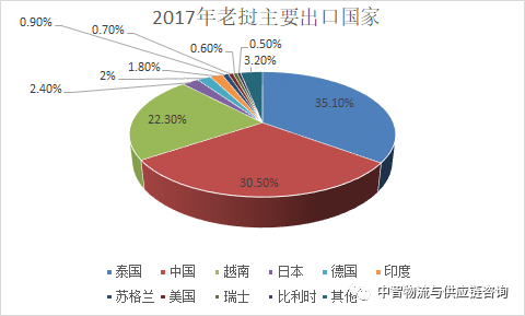 老挝的主要出口伙伴国家为泰国,占了老挝总出口的35.10%;第二出口伙伴国为中国,占老挝总出口额的30.50%;排在中国后面的为越南。占到出口规模的22.3%。与此同时,泰国是老挝最重要的商品进口伙伴,进口泰国商品占到老挝全部进口规模的60%以上。相比于泰国,老挝向中国进口商品仅占17%左右。与出口国排名相同,进口国排名第三的仍然是越南,它既是老挝重要的产品贸易出口对象,也是关键的贸易进口对象。日本、德国、印度则分别是老挝第四、五、六大的贸易伙伴。