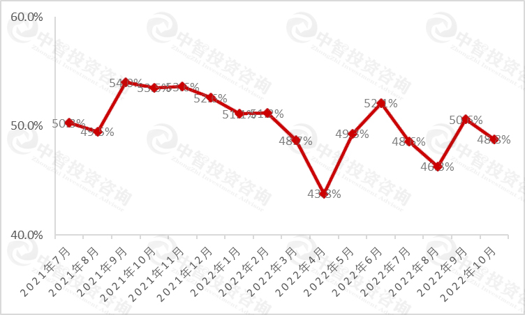 ▲图2 2021年7月-2022年10物流业景气指数变化趋势
