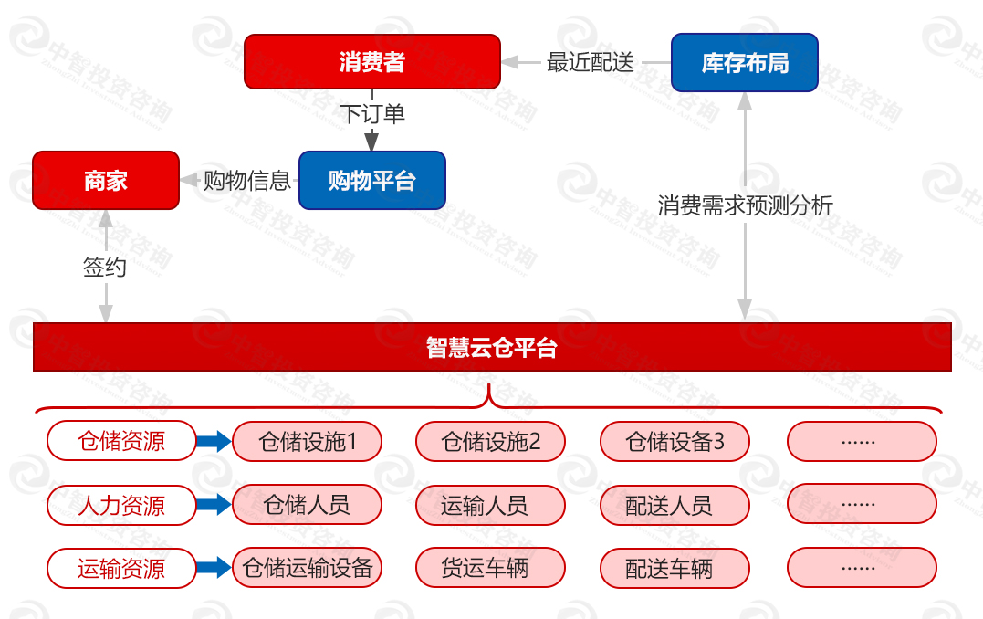 智慧物流园区的云仓模式是指通过一个信息化平台,整合社会服务的仓储资源和配送资源,通过商家与云仓平台签订协议,云仓平台根据未来市场需求数据进行预测分析,布局库存,一旦消费者下单,将就近匹配最近仓储点位进行货物配送至消费者。云仓模式整合仓储资源,合理分配库存,优化库存布局,实现上下游供应链企业的协同发展,提高物流效率。