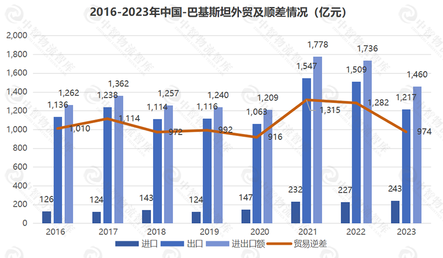 中巴双边贸易持续展现出稳健的增长趋势但增长幅度相对较为温和,同时贸易结构正逐步趋向优化。巴基斯坦位处南亚次大陆西北部,邻阿拉伯海,拥有980 公里海岸线,连接印度、中国、阿富汗、伊朗等多国,是中亚、西亚与南亚关键贸易枢纽,在区域贸易版图中占据着举足轻重的战略地位。其超 2.4 亿人口构建庞大消费市场,对中国机械设备、纺织品、金属制品等需求强劲,外贸潜力巨大。2024年1-10月,中巴双边贸易总额达1300.67亿元人民币,同比增幅达到8.96%。具体来看,中国对巴基斯坦的出口额为1143.60亿元人民币,同比增长14.75%;而中国从巴基斯坦的进口额为157.07亿元人民币,同比下降20.30%;中巴贸易顺差达986.53亿元人民币,约7倍。回顾2016年至2023年的八年发展历程,中巴贸易额实现了从1262亿元到1460亿元的稳步增长,平均年增长率达到2.13%,增长幅度有限。值得注意的是,期间中巴贸易顺差的比例从2016年的约9倍降至了5倍,贸易结构逐步优化。