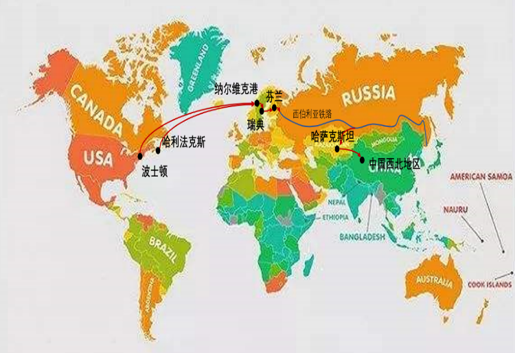 UIC计划从美国东北部和加拿大(波士顿和哈利法克斯)通过挪威的纳尔维克港口,途径瑞典、芬兰、俄罗斯和哈萨克斯坦,与中国西北地区建立货运连接,并通过西伯利亚铁路连接至太平洋上的俄罗斯港口,该走廊将缩短从中国西部和中部偏远地区到美国东北部和加拿大的工业中心的货运时间。根据UIC的数据,这条线路上的货运量每年每个方向可达到19万~24万标箱。