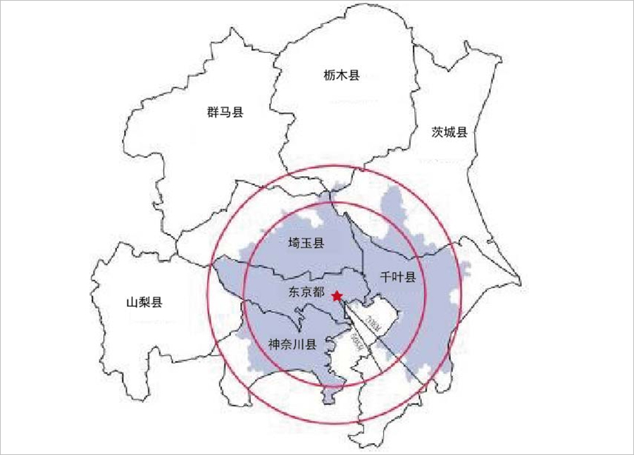 东京都市圈位于日本关东平原,面临东京湾,是日本三大都市圈之一,包括东京都、神奈川县、千叶县、埼玉县以及茨城县南部的部分地区,面积约为1.6万km2,人口超过3700万人。东京都市圈的面积仅占日本国土的4.1%,却集中了全国人口的28.2%(夜间人口),年批发额占全国的45.6%,产业和商业活动都非常活跃,是一个人口、产业高度集中的地区。