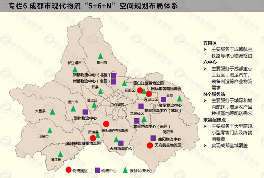 ▲ 图-成都市现代物流业发展“十三五”规划-空间节点布局“五园区-六中心-N服务站”