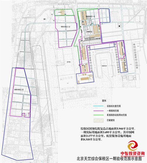 总体概况:北京天竺综合保税区于2008年7月获国务院批准设立,为全国首家空港型综合保税区。总体规划面积为5.944平方公里(一期封关运营面积为3.177平方公里,于2009年由海关总署等国家十部委联名验收)。其在运营模式、区港联动、作业效率、服务功能等多方面探索创新发展,逐步形成了医药、航空、文化三大特色产业。现入驻企业500多家,2015年进出口总值达781亿美元,关税及代征税388亿元,空港货邮吞吐量10年间由78万吨增长到189万吨,区内从业人员2.5万人,带动周边近200万方的商业项目开发,实现了港、产、城的联动发展。